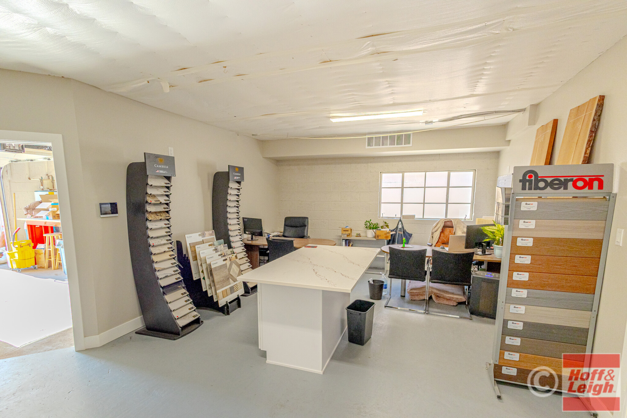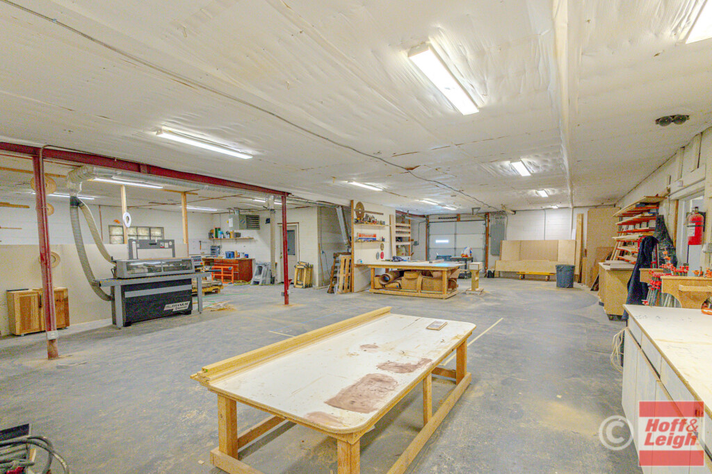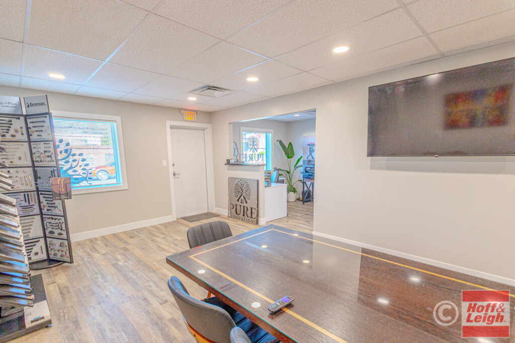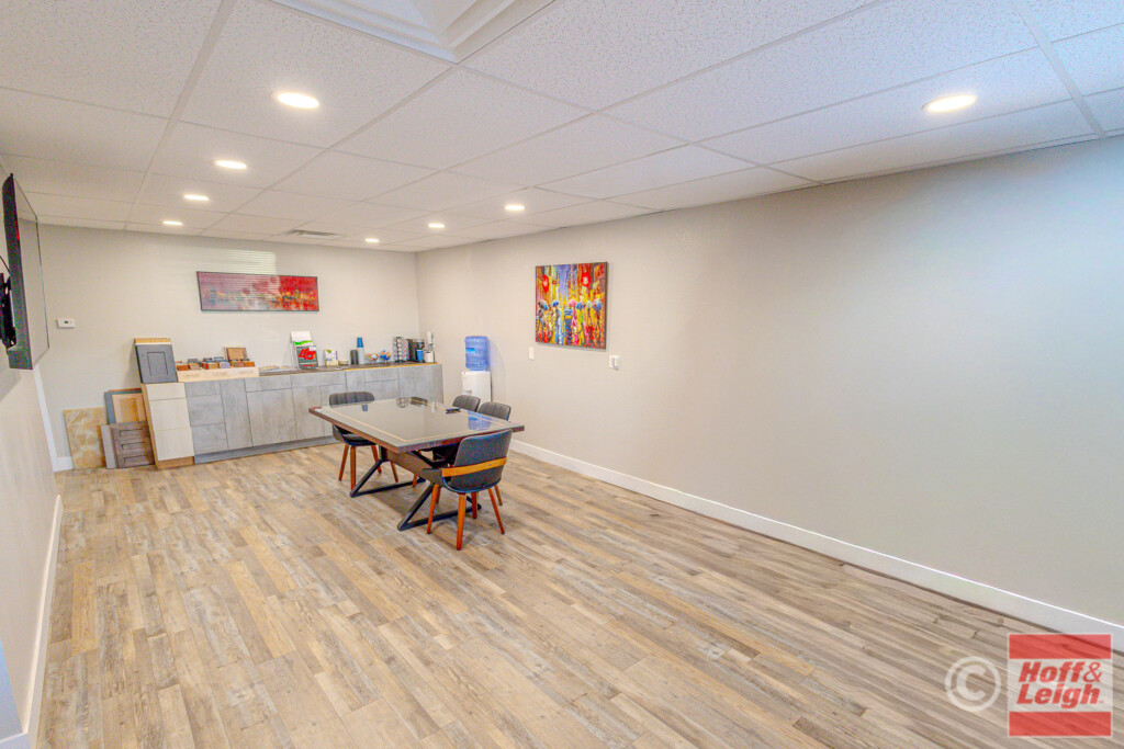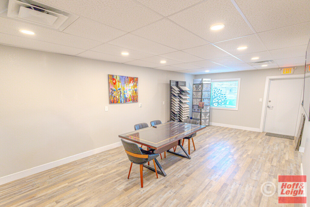 The front portion of the building has been nicely finished with modern office/showroom space, including upgraded flooring, recessed lighting, and a clean, professional layout suitable for client-facing use. This creates an ideal setup for contractors, fabricators, or service-based businesses needing both operational and customer-facing space.