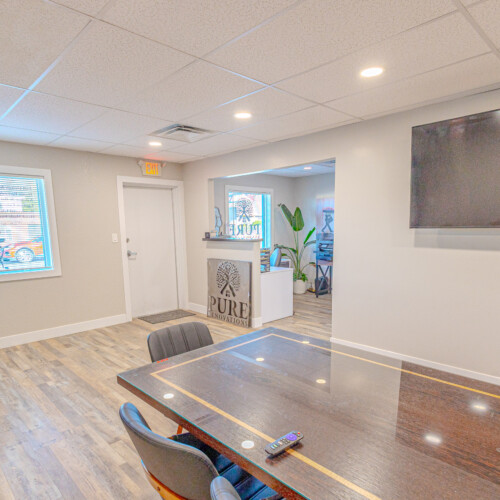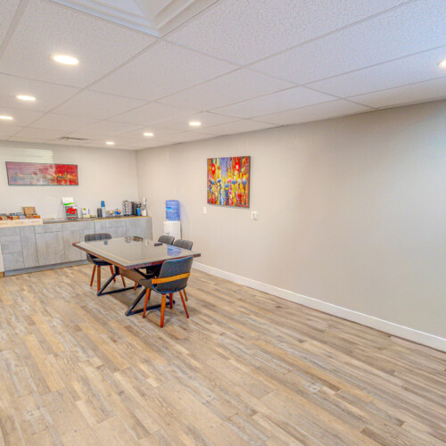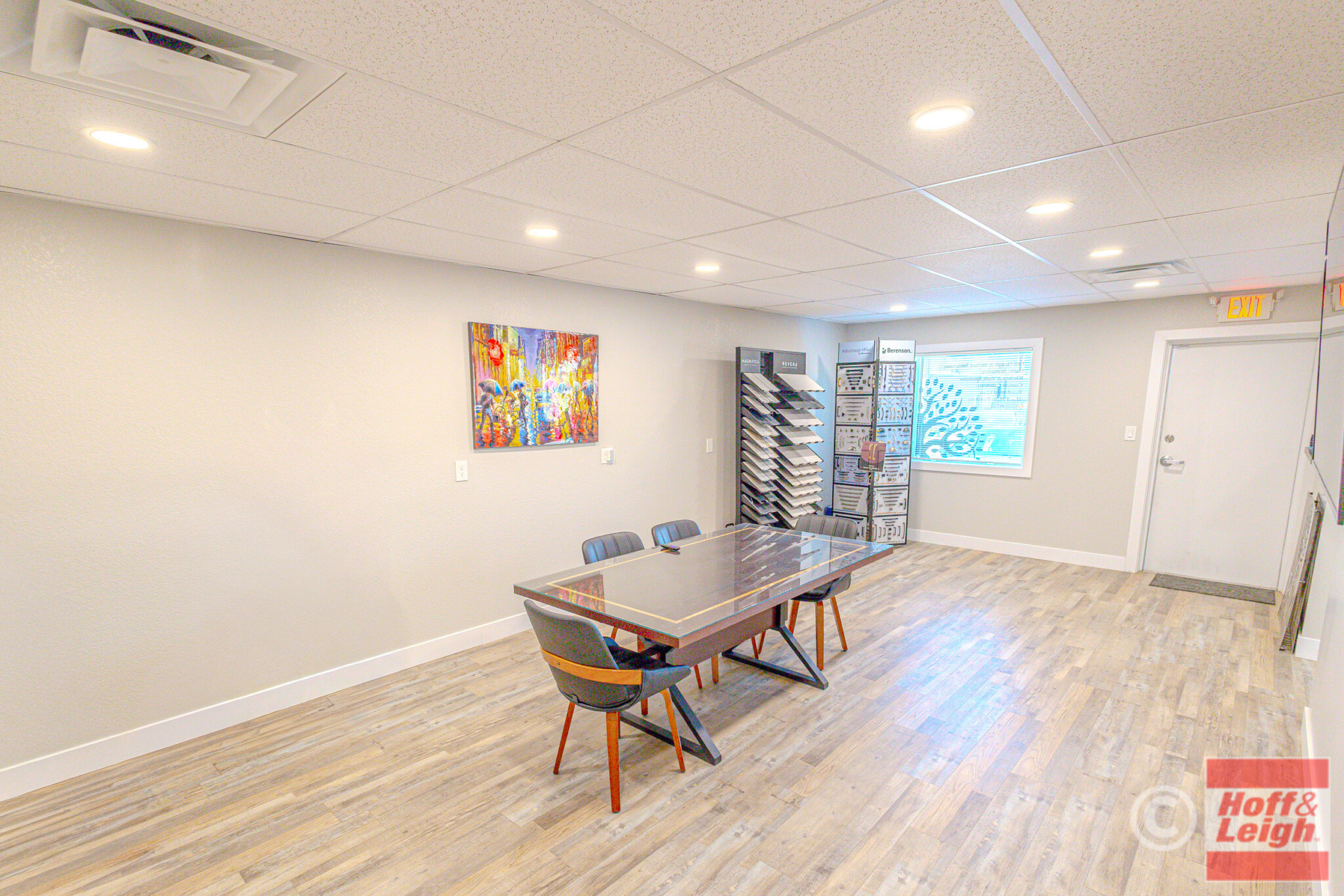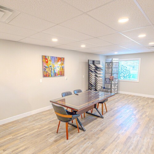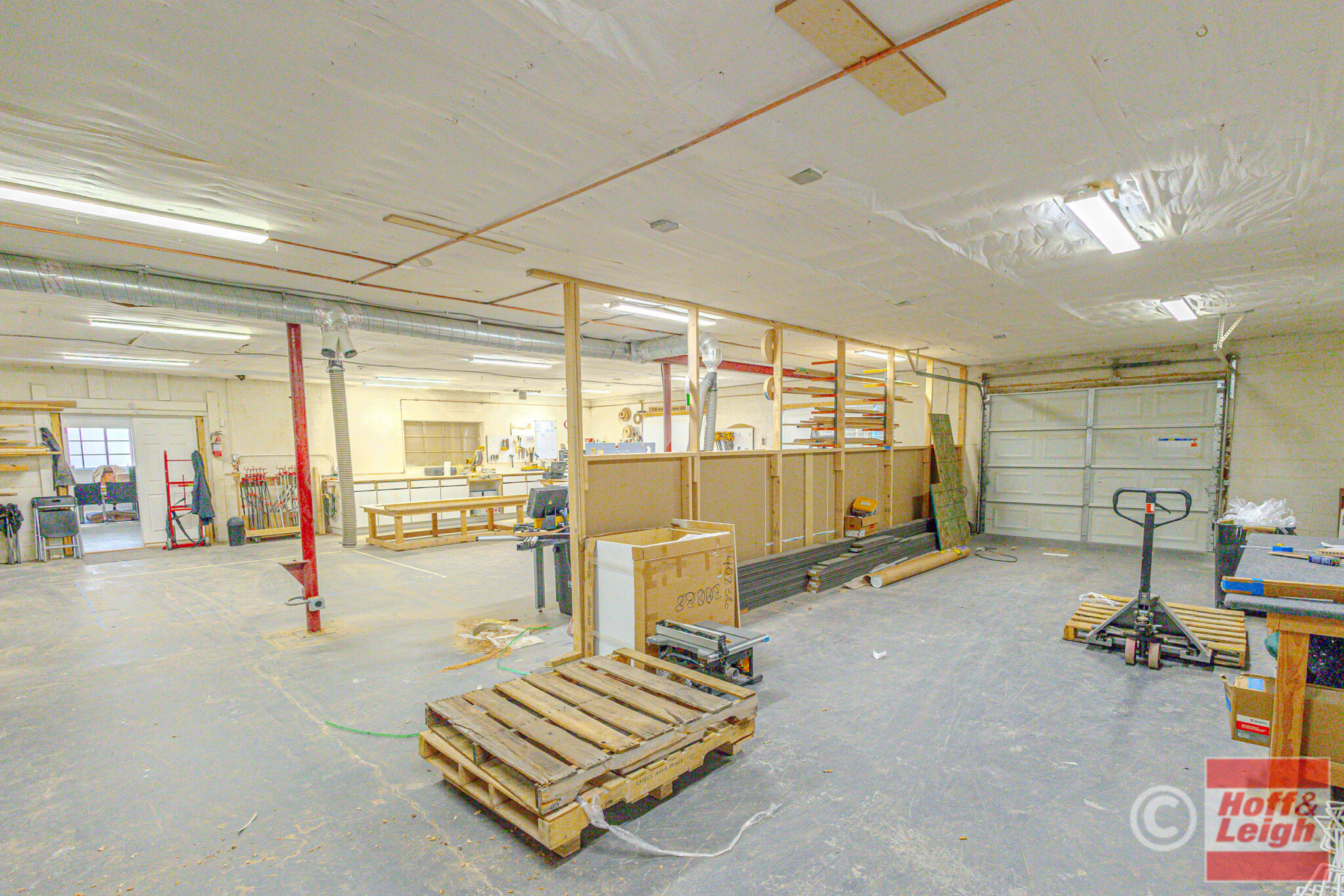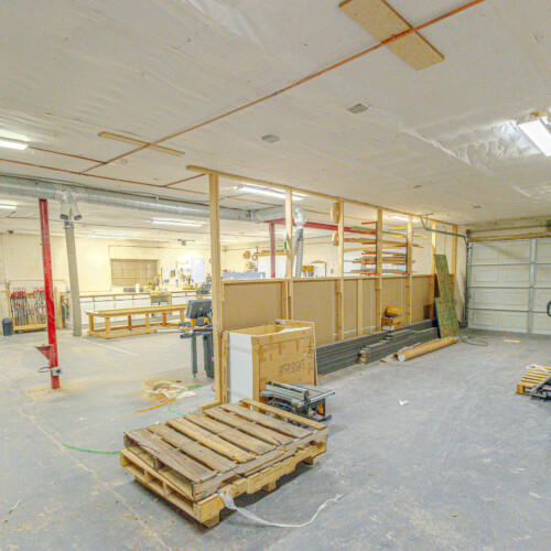 The front portion of the building has been nicely finished with modern office/showroom space, including upgraded flooring, recessed lighting, and a clean, professional layout suitable for client-facing use. This creates an ideal setup for contractors, fabricators, or service-based businesses needing both operational and customer-facing space.