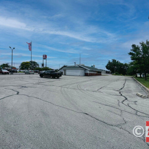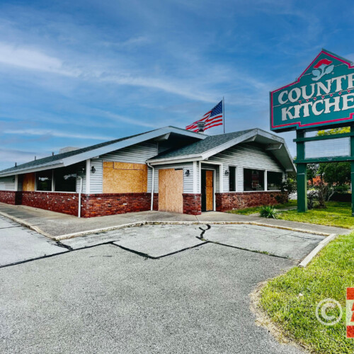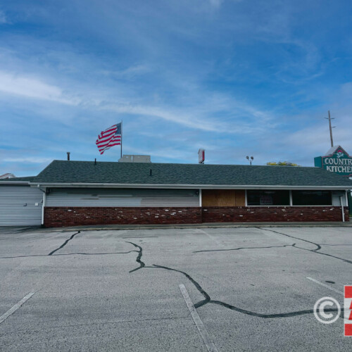 Former Country Kitchen restaurant building surrounding Midway Mall retail area and located near major highways and other national retailers.